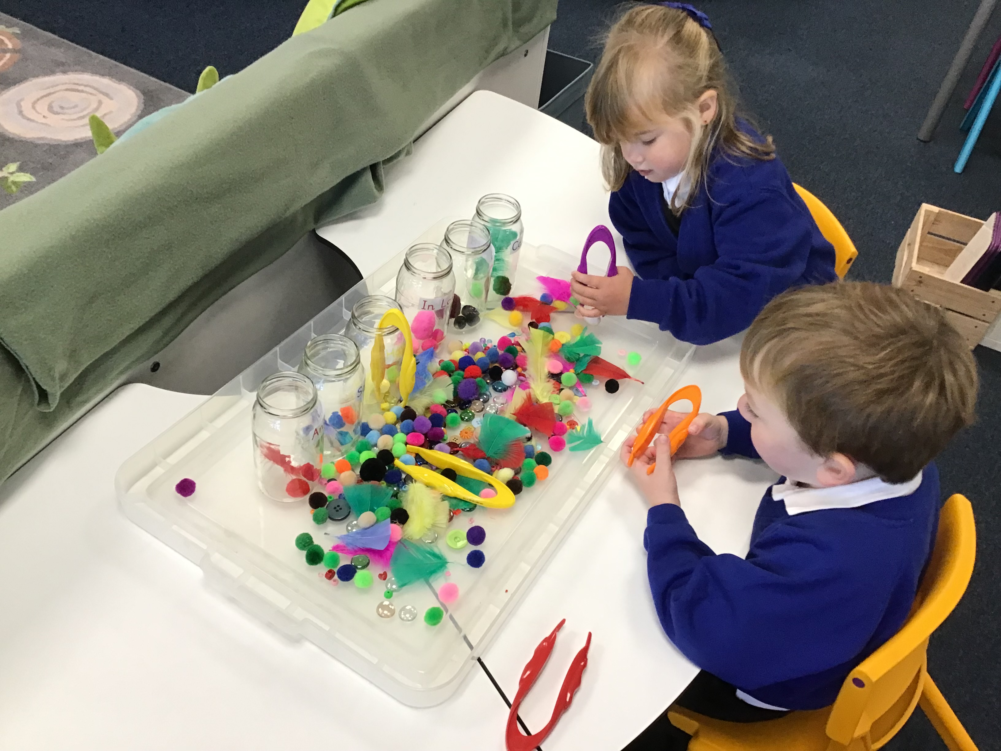 Our sensory trays were themed around different emotions. The children explored textures and colours, then used tweezers to sort items into jars based on how they thought each colour might feel—great for fine motor skills and emotional awareness.