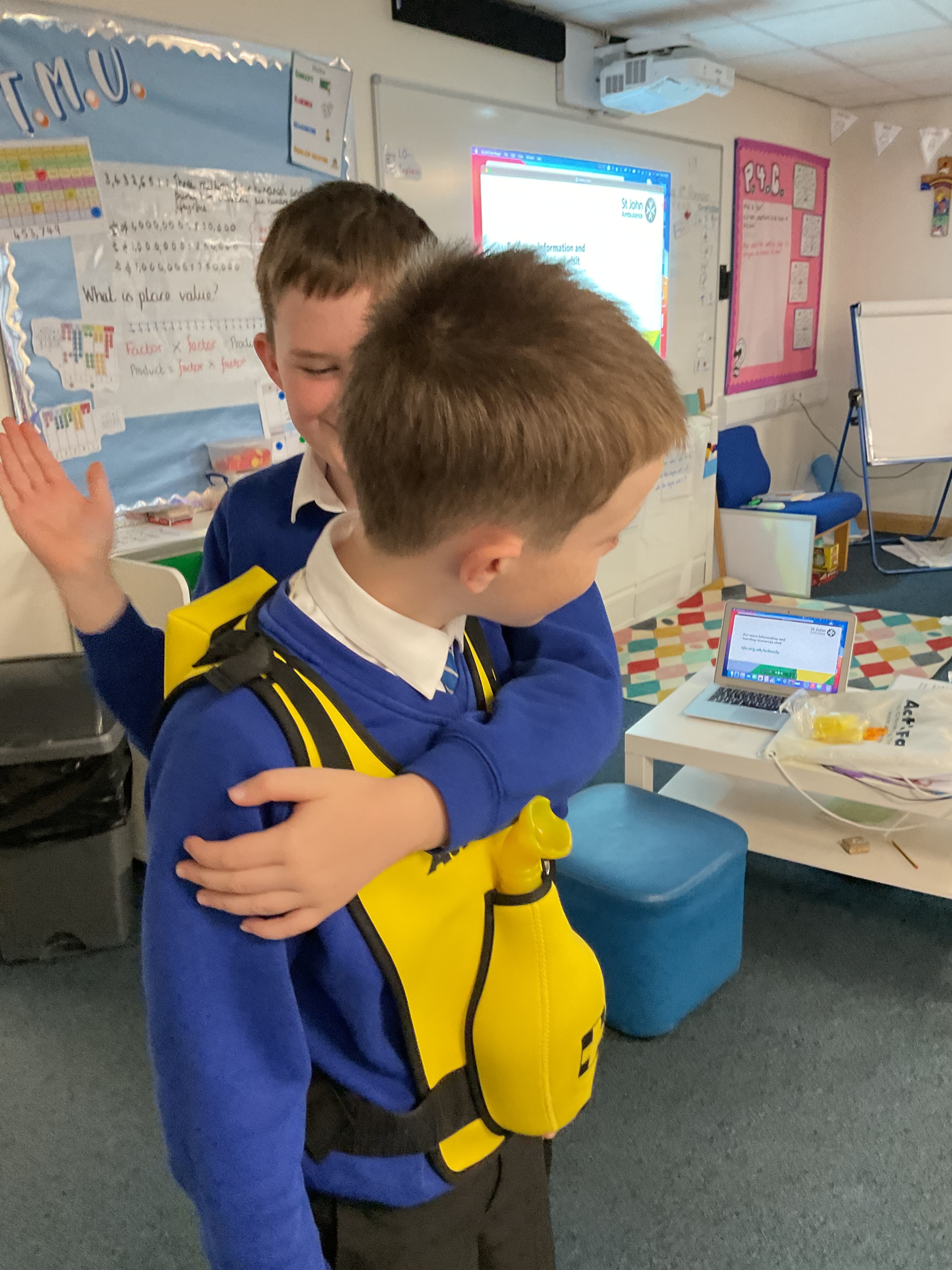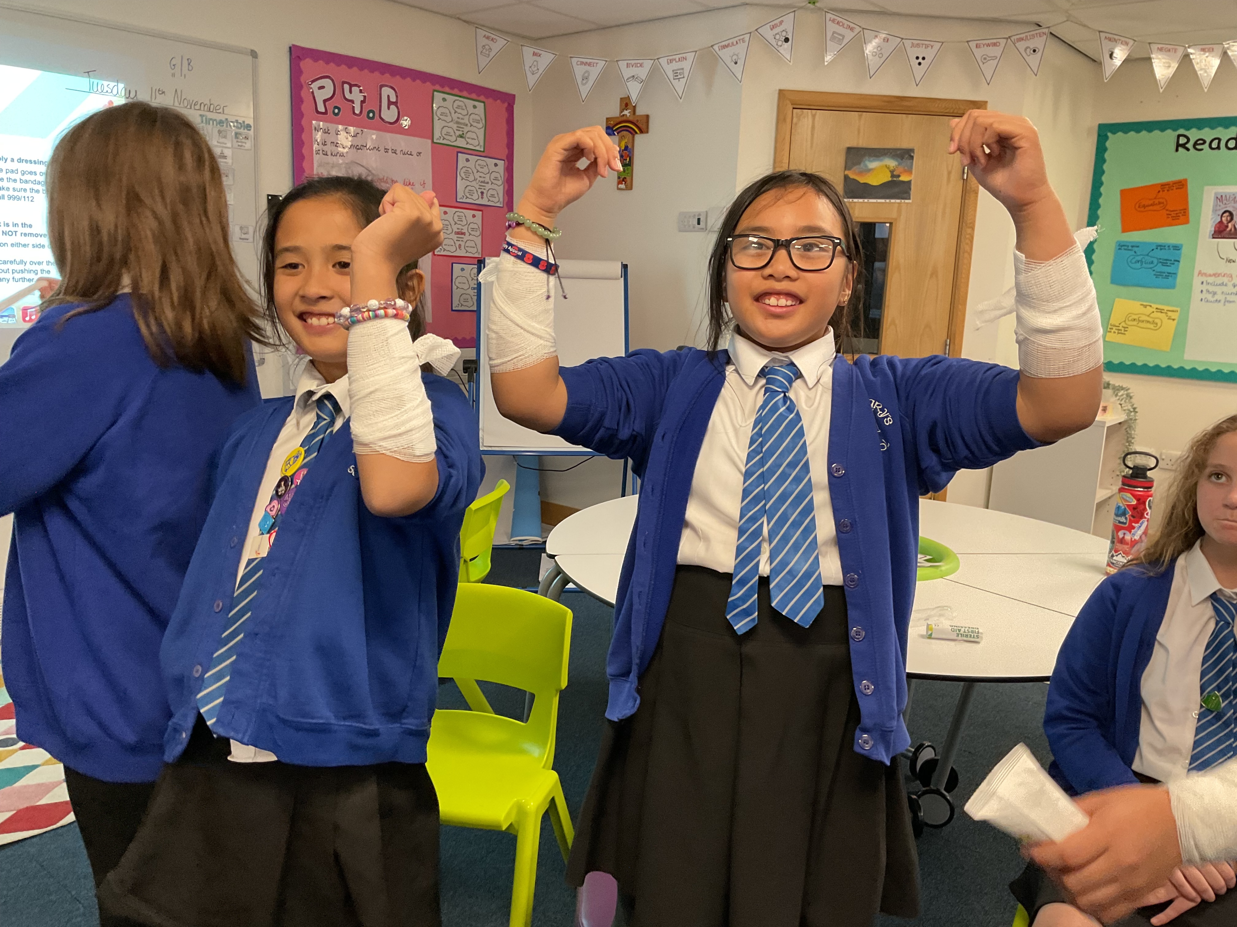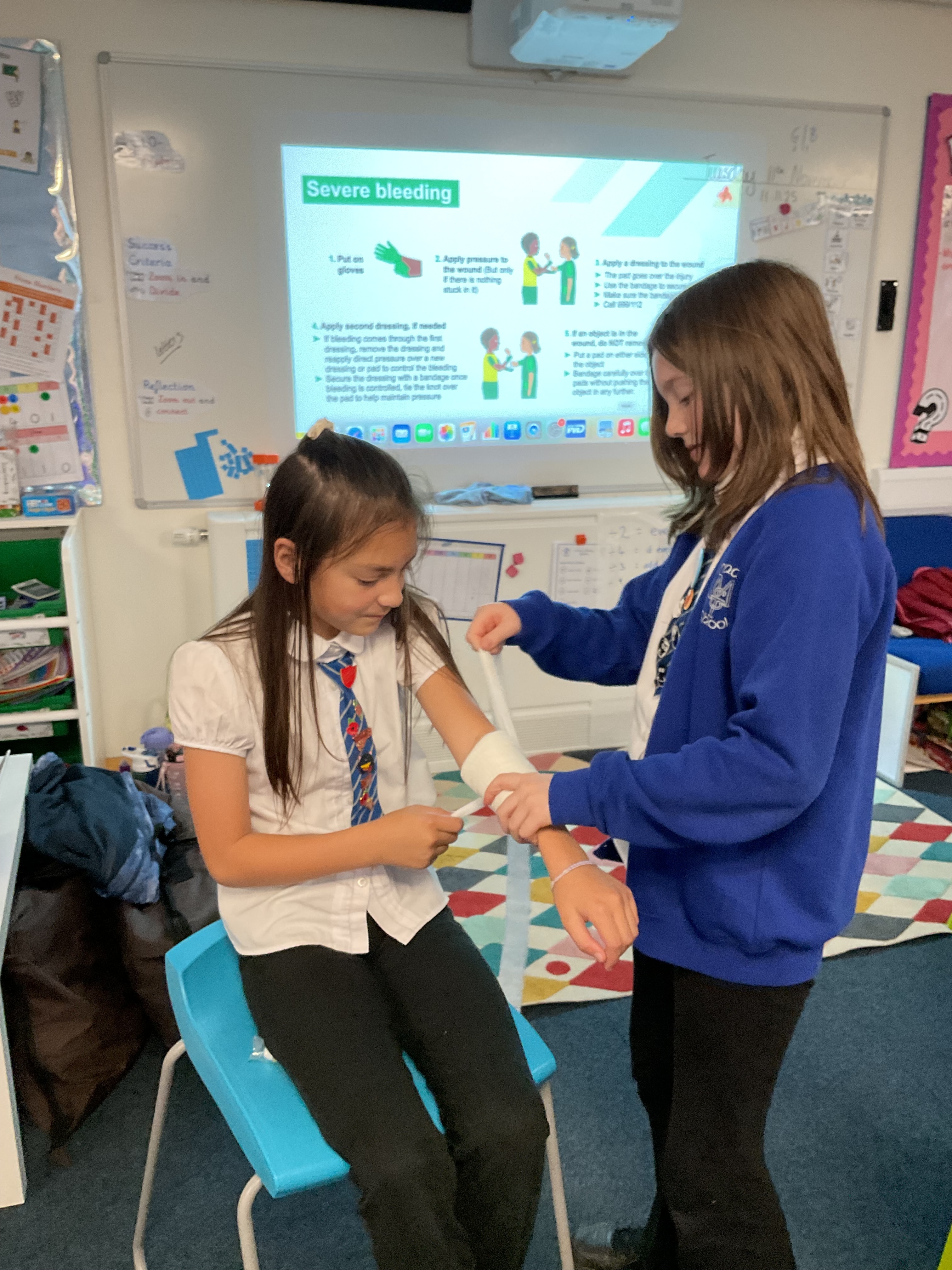 St George had a great and really informative day learning first aid skills. Jill from St John's Ambulance came in to train the class in emergency and live saving skills. We learnt how to help a casualty with a serious cut, burn or someone who is choking. The children learnt how to put someone in the recovery position and how to perform CPR.