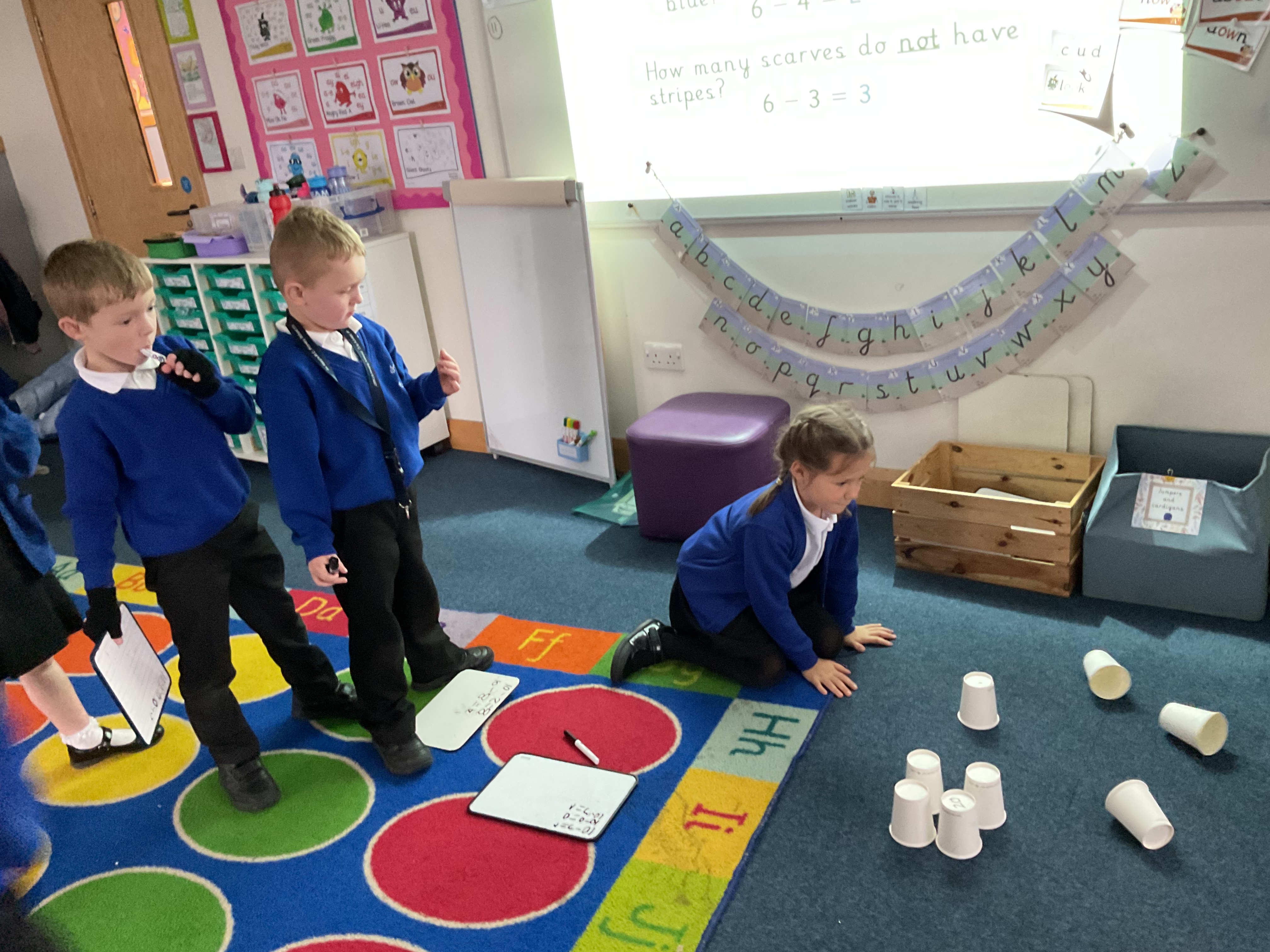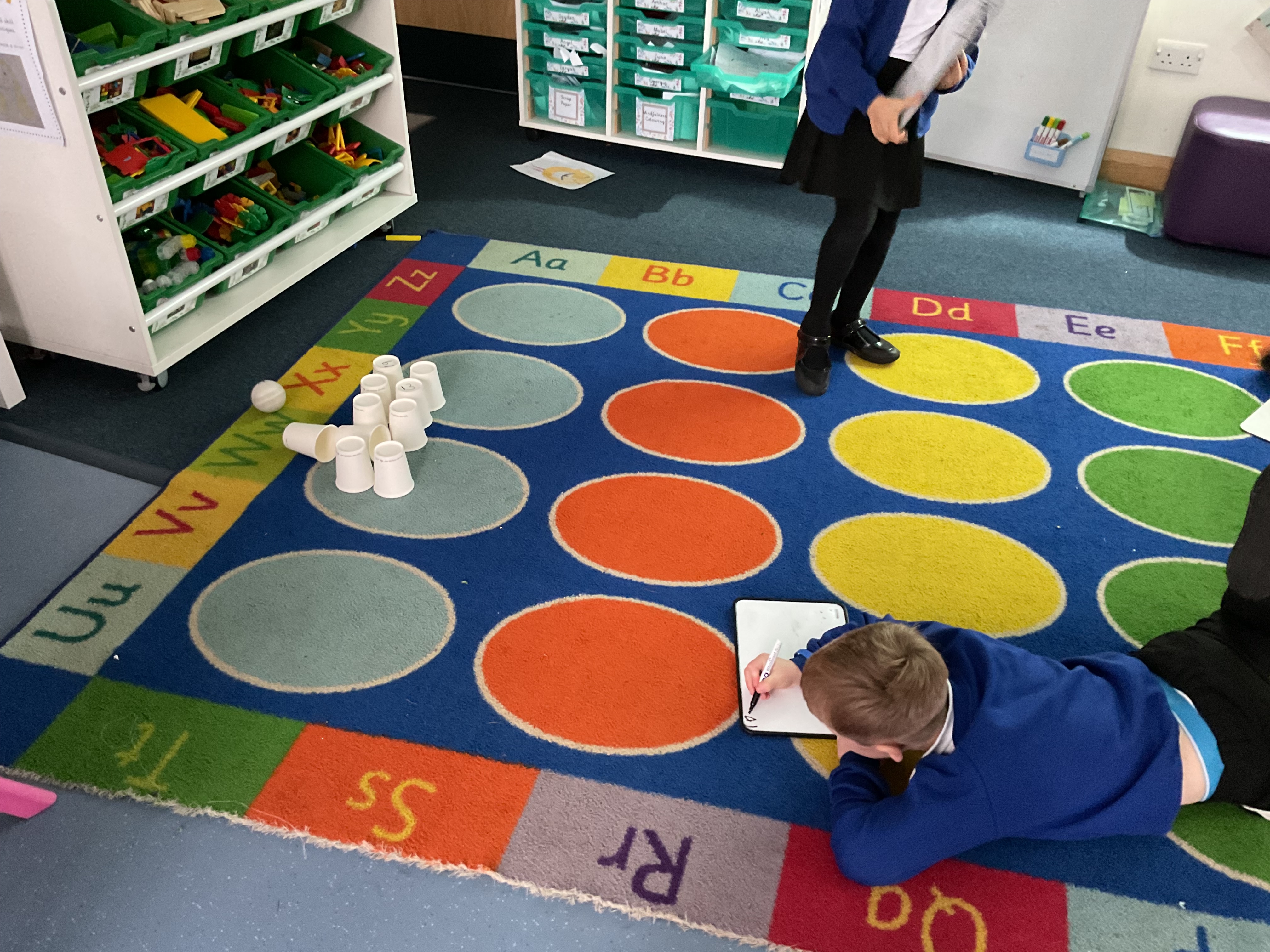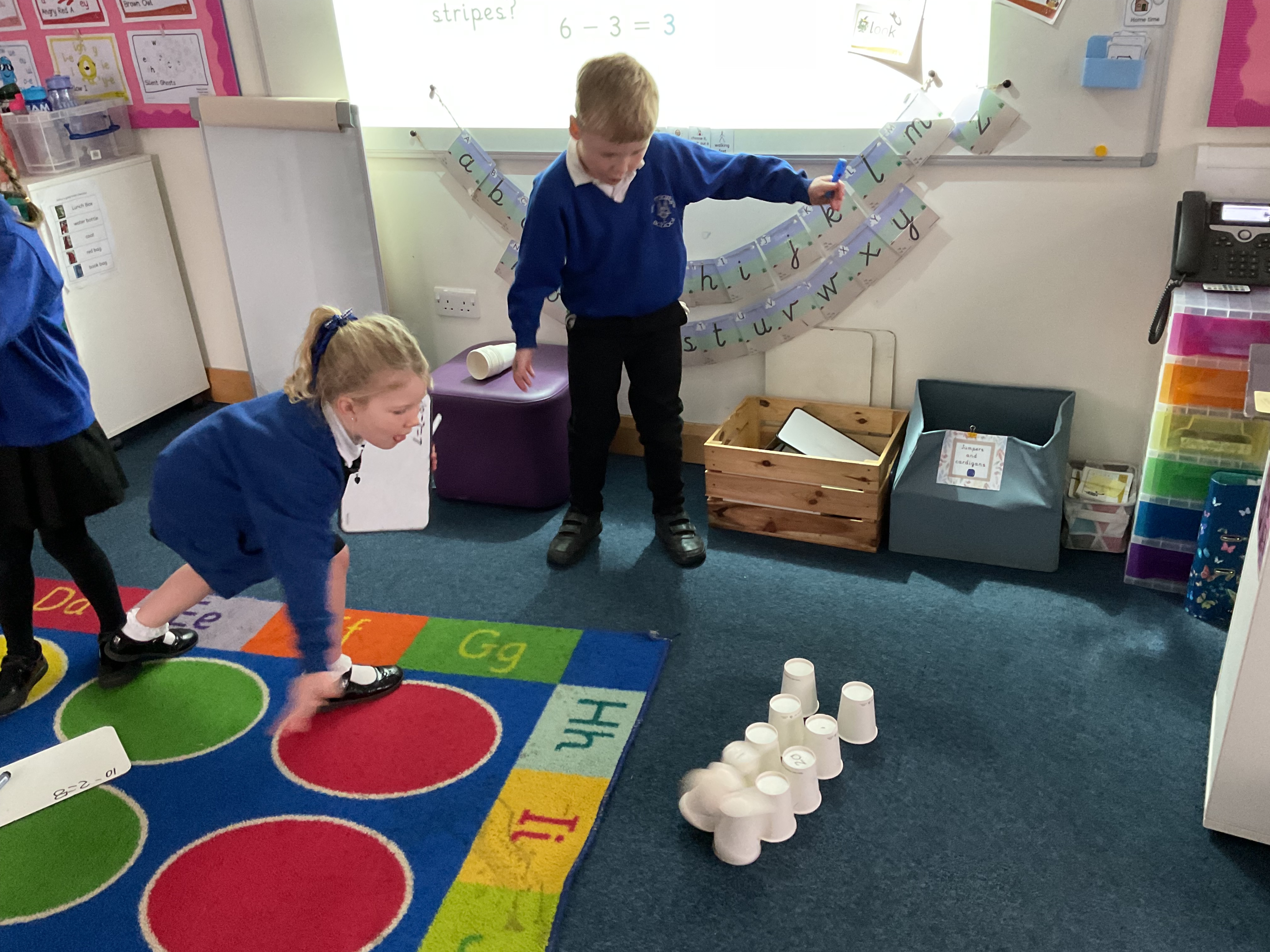 We’ve been having so much fun exploring subtraction with our very own bowling game! We set up 10 cups as pins, rolled the ball, worked out how many were left, and wrote a subtraction sentence to match. What fun we had!