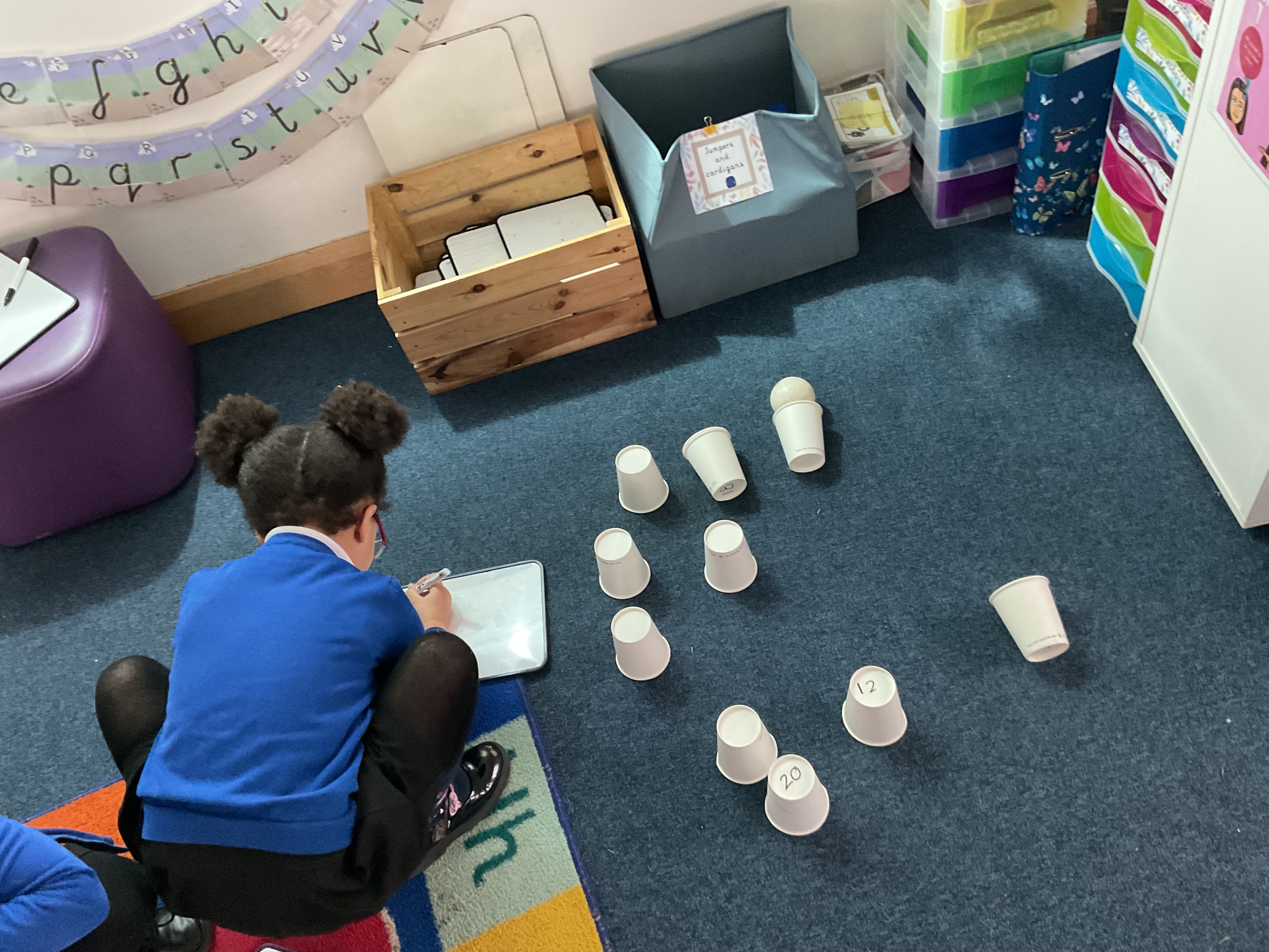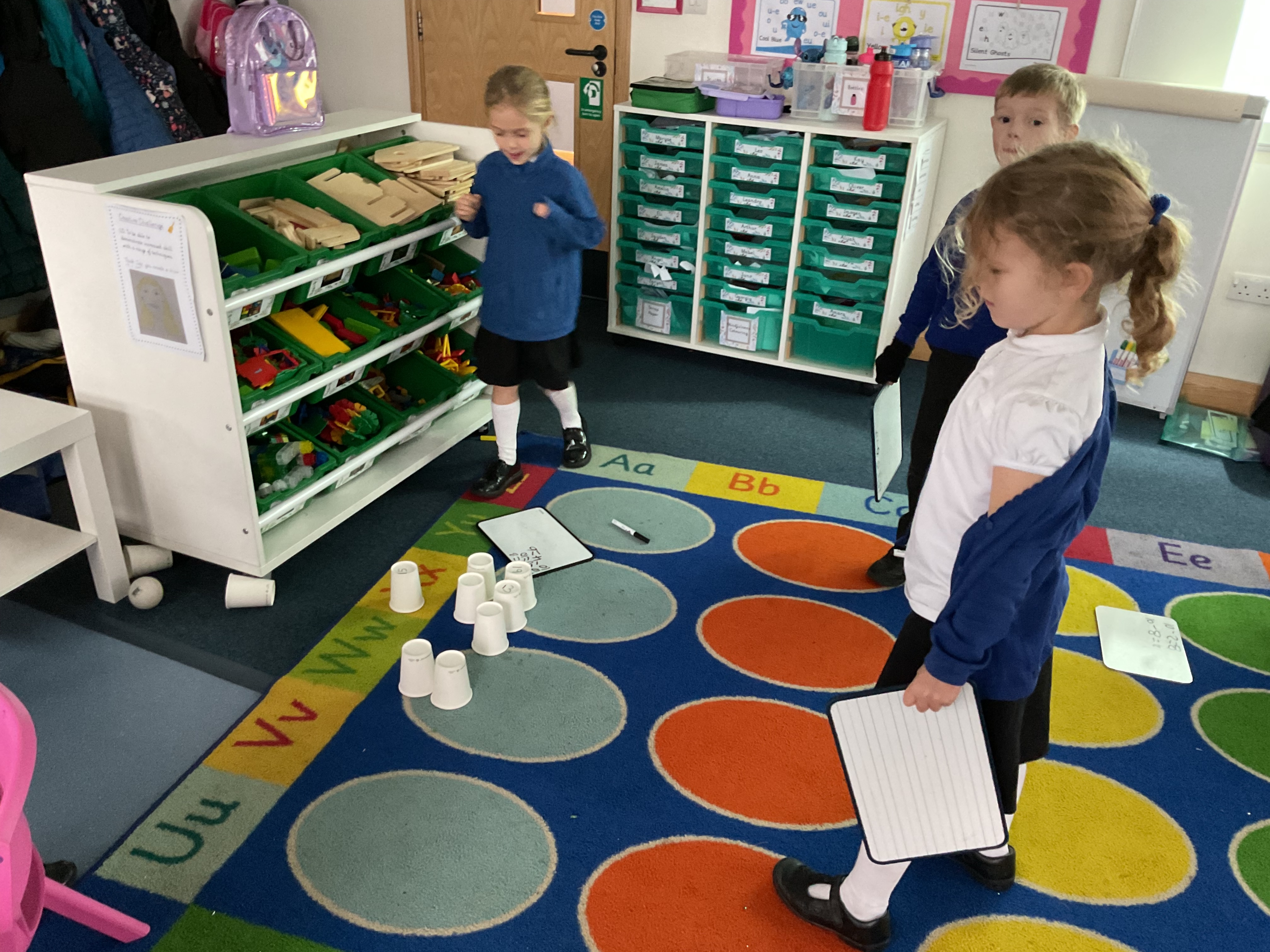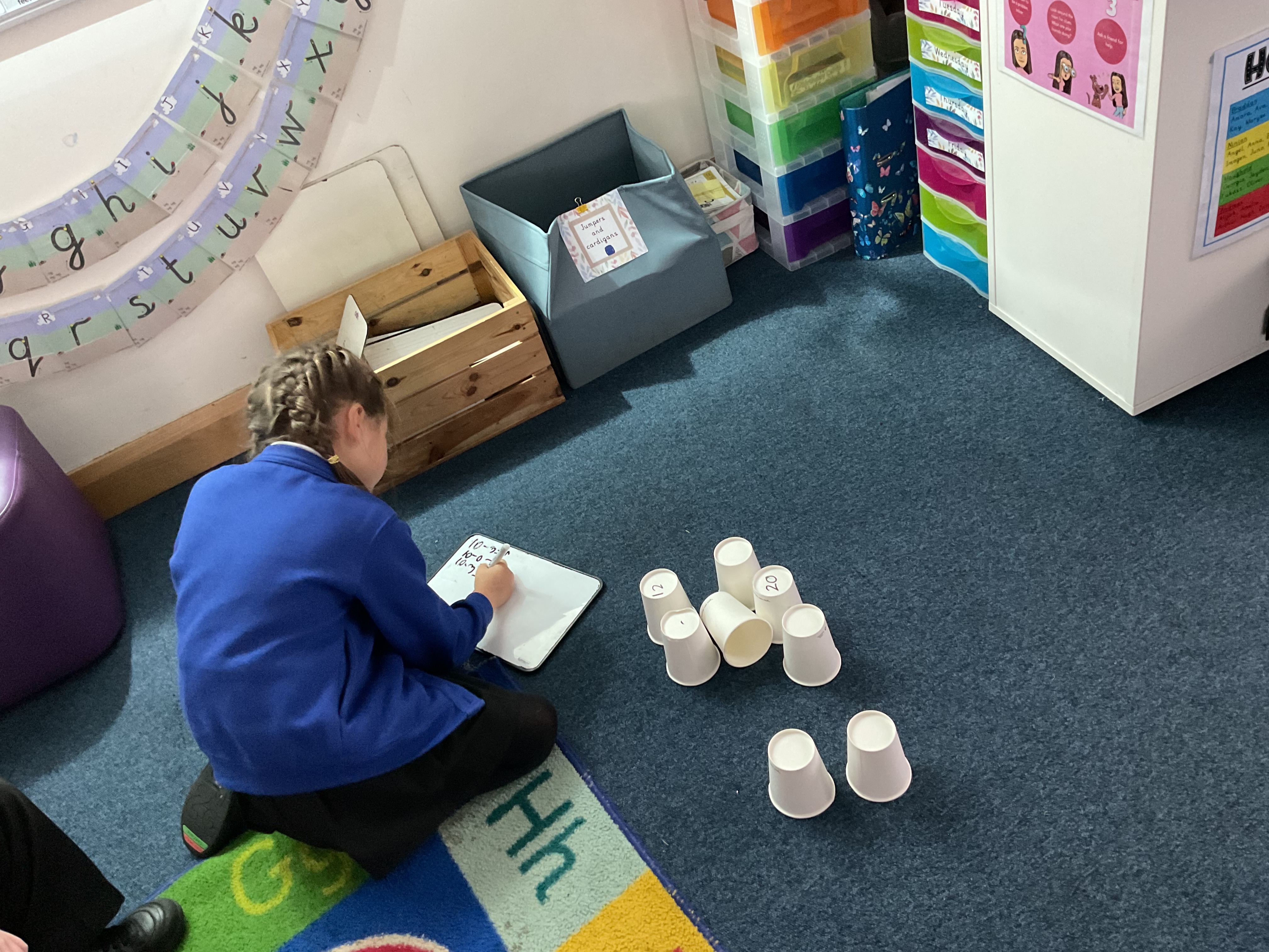 We’ve been having so much fun exploring subtraction with our very own bowling game! We set up 10 cups as pins, rolled the ball, worked out how many were left, and wrote a subtraction sentence to match. What fun we had!