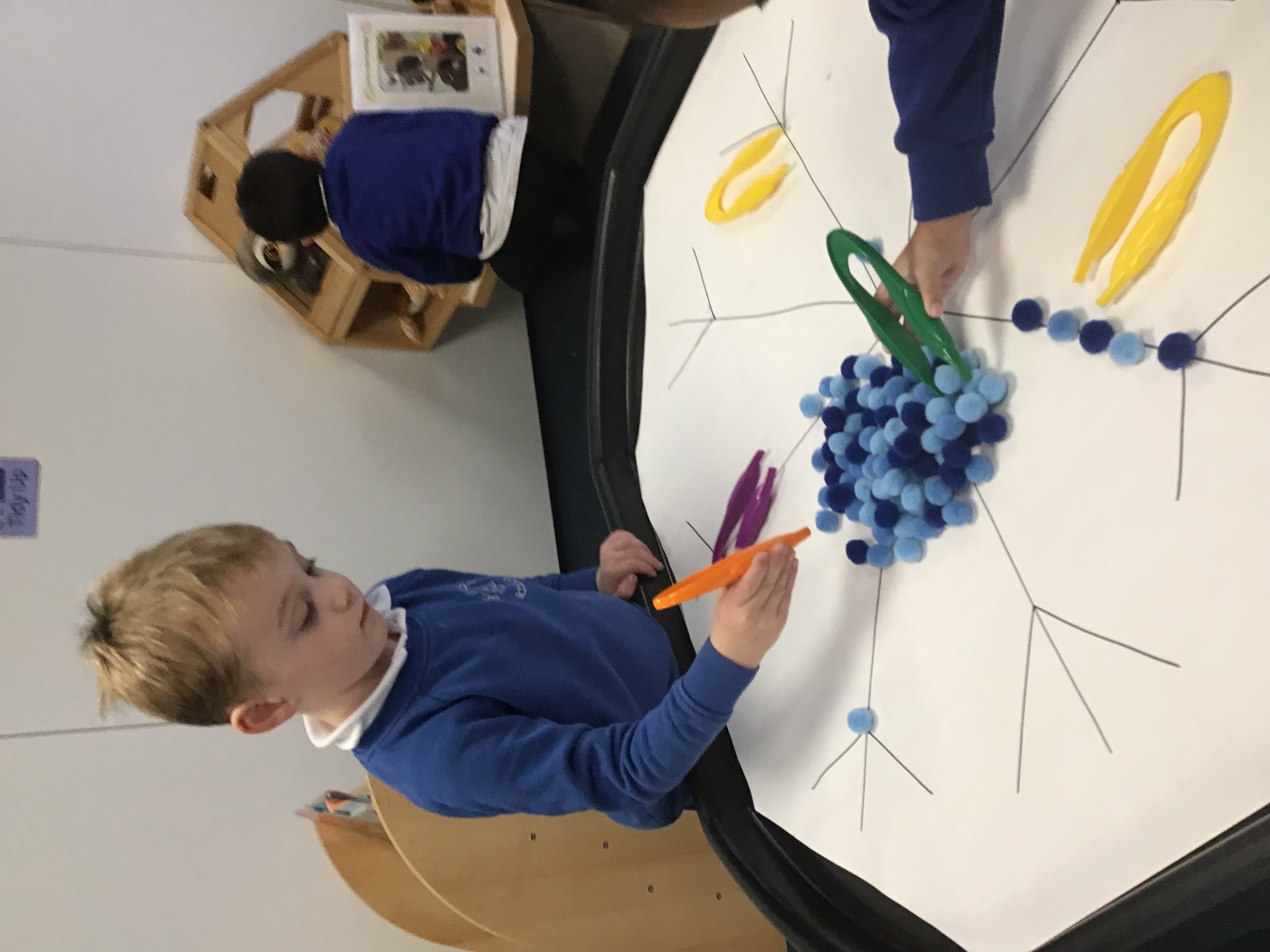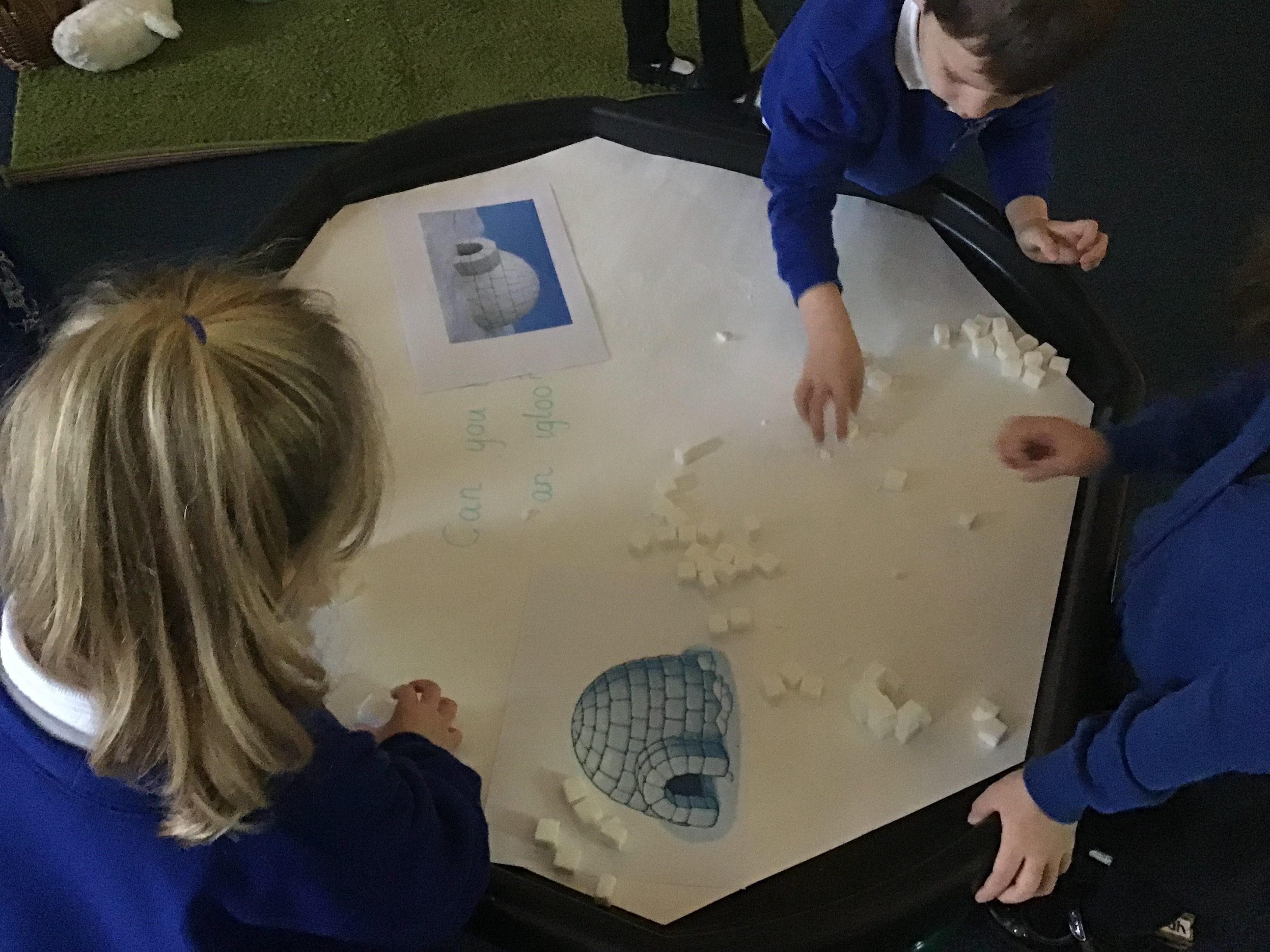 - Tuff Tray: We built an igloo using sugar cubes and polystyrene. We also used tweezers to place pom-poms onto a snowflake, which was great for our fine motor skills.