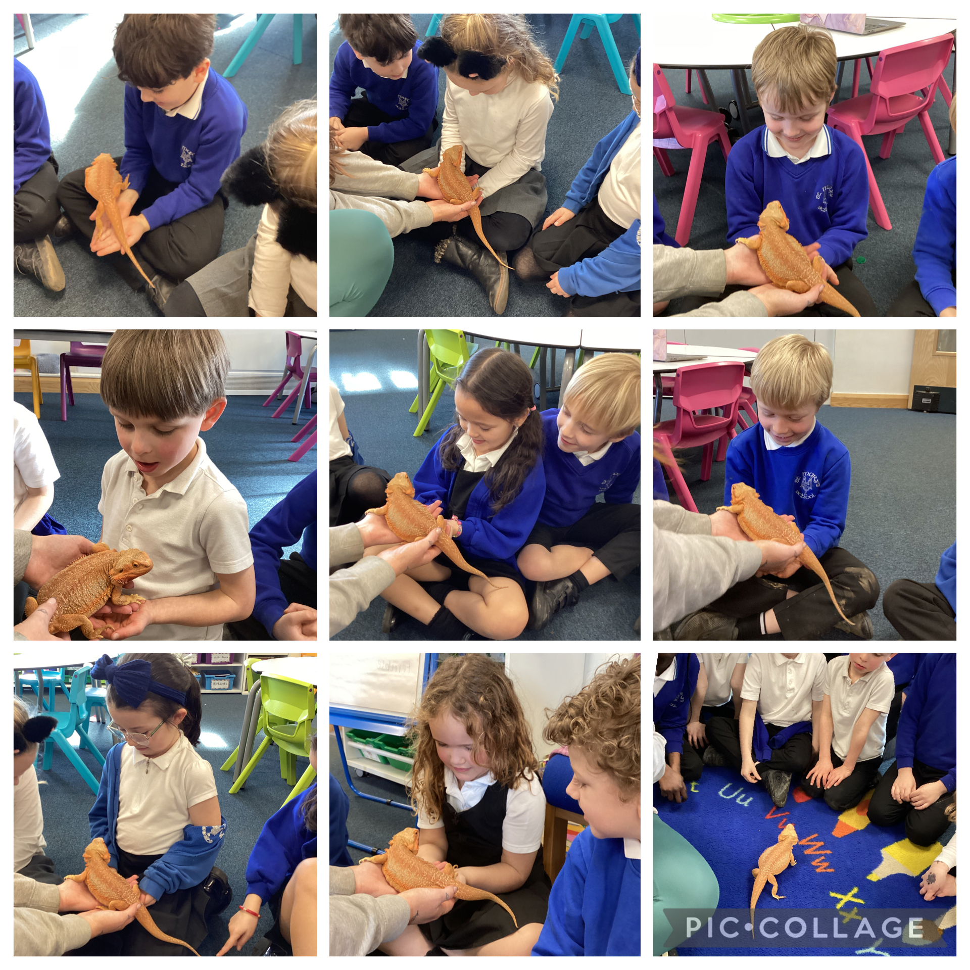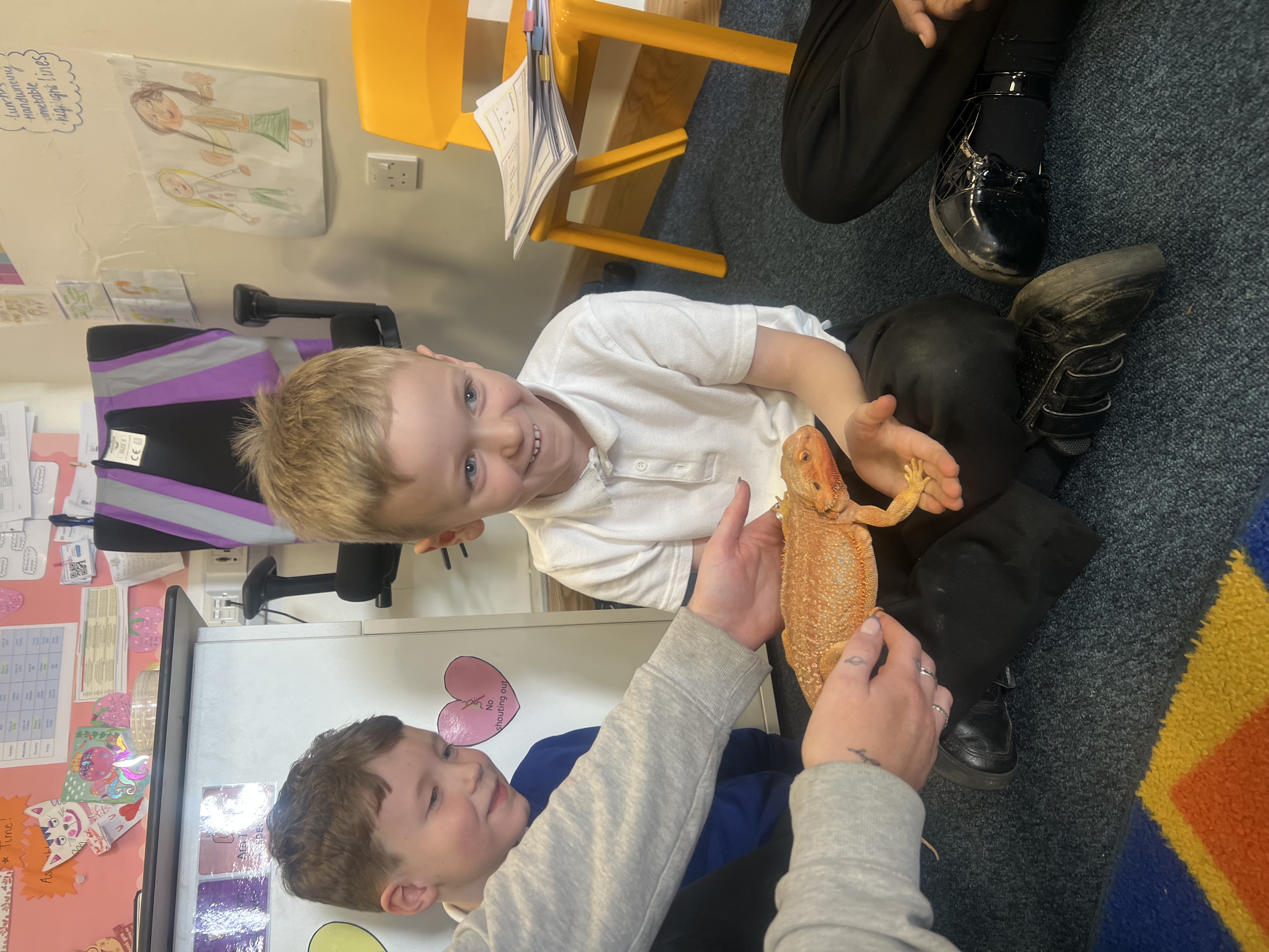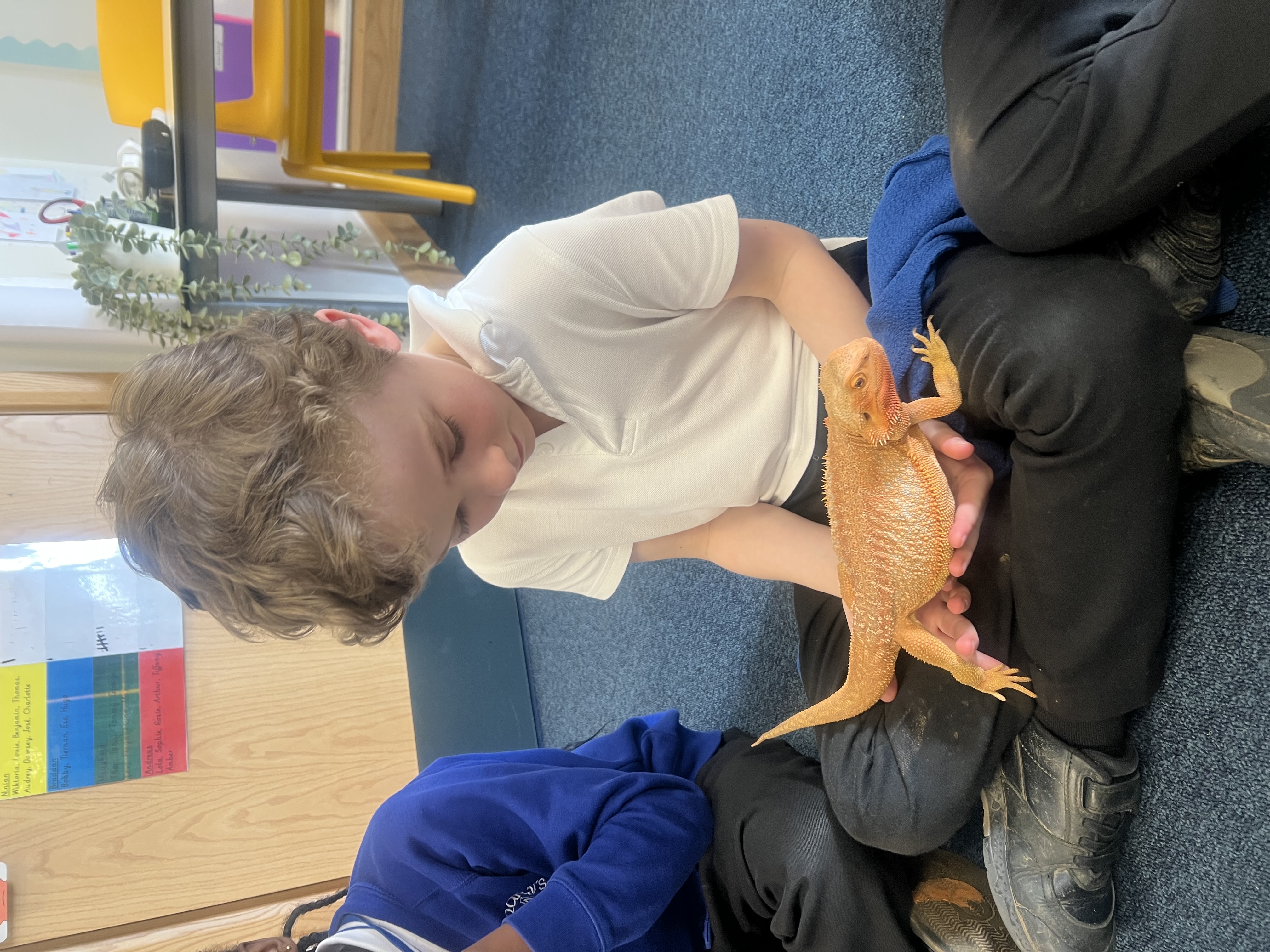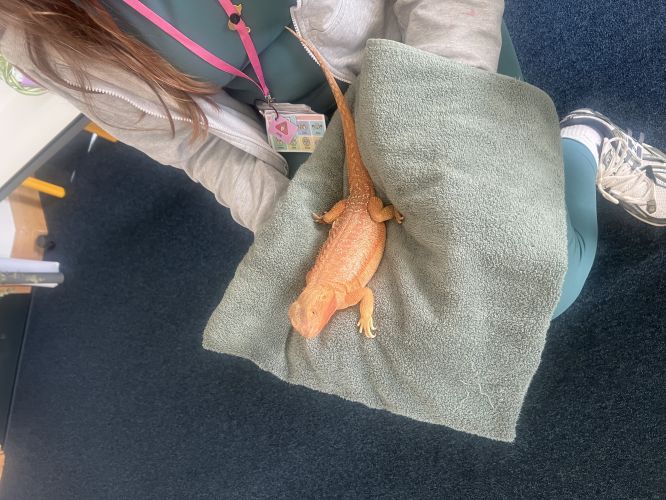 Today we got to meet Miss McGilvray’s bearded dragon! We loved seeing her up close and were full of brilliant questions. We talked about where bearded dragons live in the wild, the warm habitats they need, and the kinds of food they enjoy eating. We were especially fascinated to learn how she changes colour to help her communicate and stay safe.