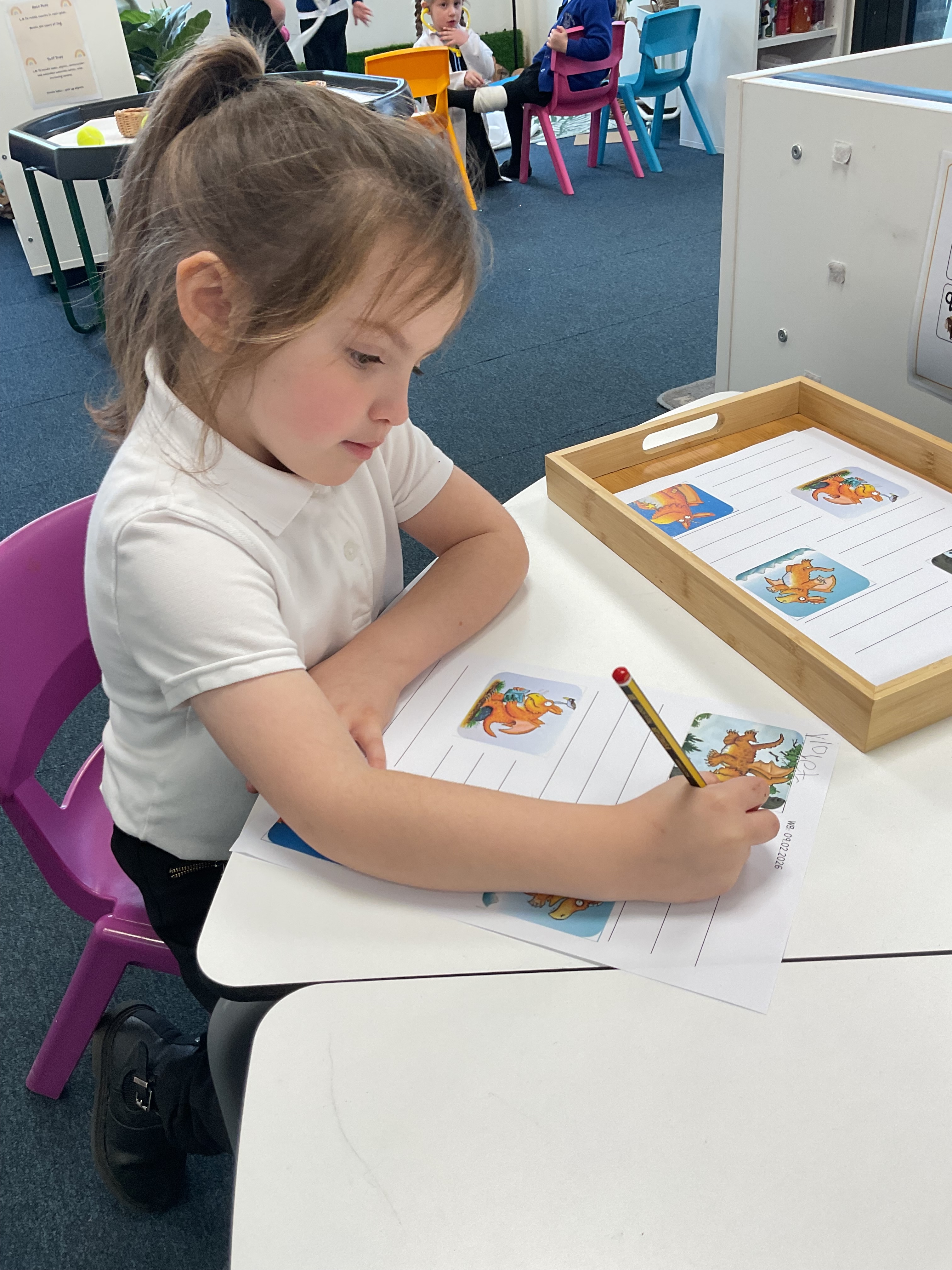 Writing: The children wrote captions for different pages of Zog, using their phonics to describe what was happening in the story.
